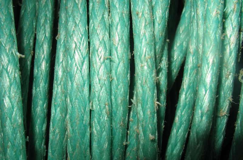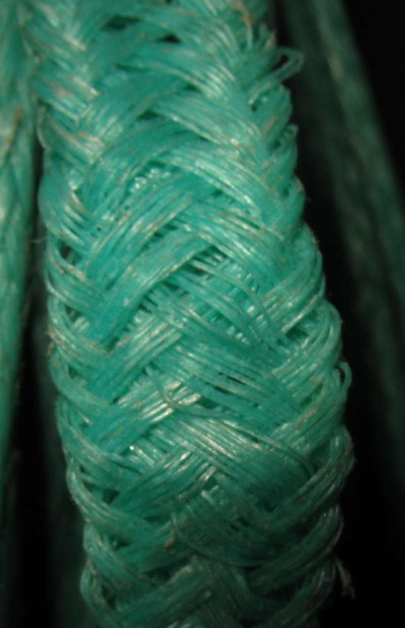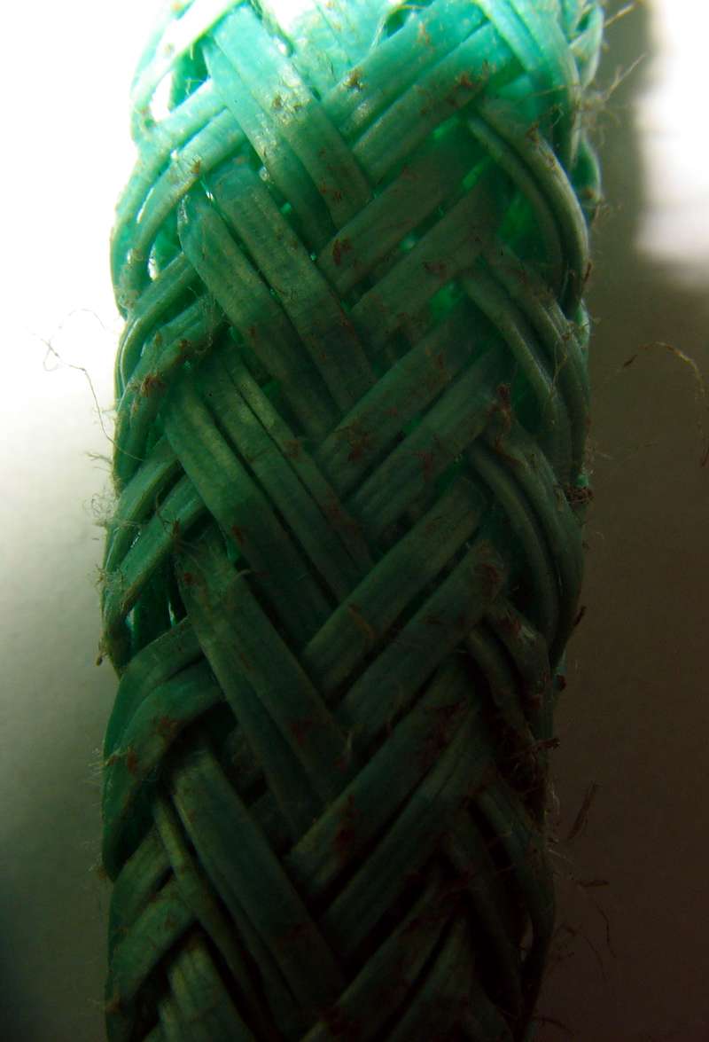 При увеличении видно, что полистиловый трос сделан из пластиноподобных нитей.